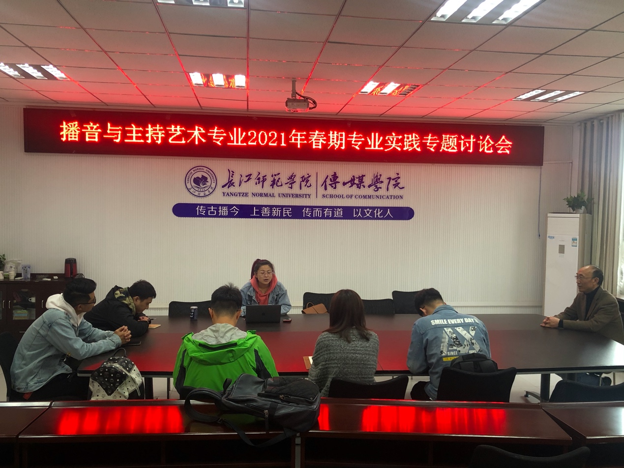 本次会议的主要议题是播音与主持艺术专业2021年春期的专业实践。系主任许芫颜首先就此次专业实践进行了介绍。本年度春期的专业实践共涉及2018级、2019级和2020级三个年级。其中,2018级的专业实践期为第15、16周,所以不在此次会议的讨论范围内,后面再进行专门讨论研究。本次会议主要针对2019级和2020级的专业实践进行讨论研究。最终初步形成了根据不同年级的具体学情开展校内集中实践与校外专业实践相结合;专题实践、综合实践与学科竞赛相融合的专业实践项目。
