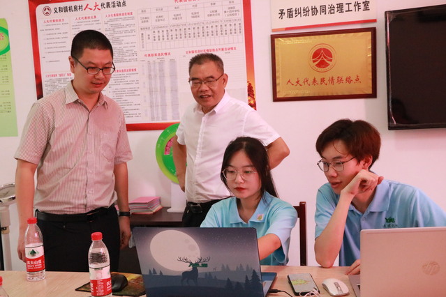 肖书记和志愿者们亲切交谈,询问了志愿者们这三天在义和镇的生活和工作情况,志愿者们向肖书记认真地答复并交代了这三天教学组和视频组的工作进度。随后肖书记和志愿者们一起观看了这几天拍摄的成果,分别对教学组、视频组、宣传组的工作进行了详细的指导,对志愿者们这几天的工作成果给予充分肯定。
