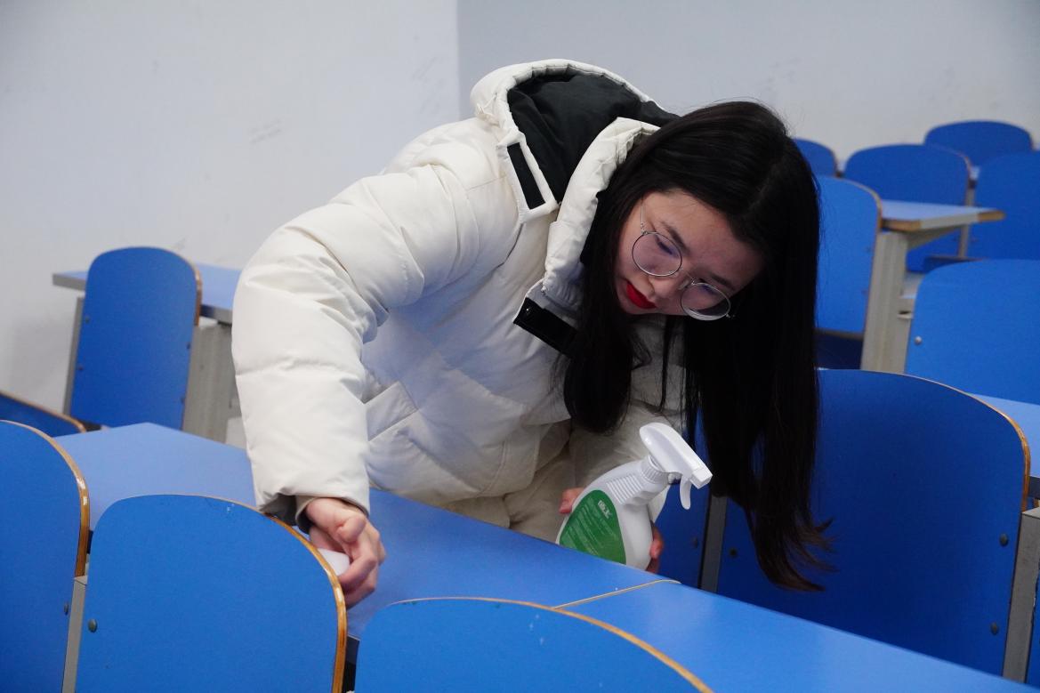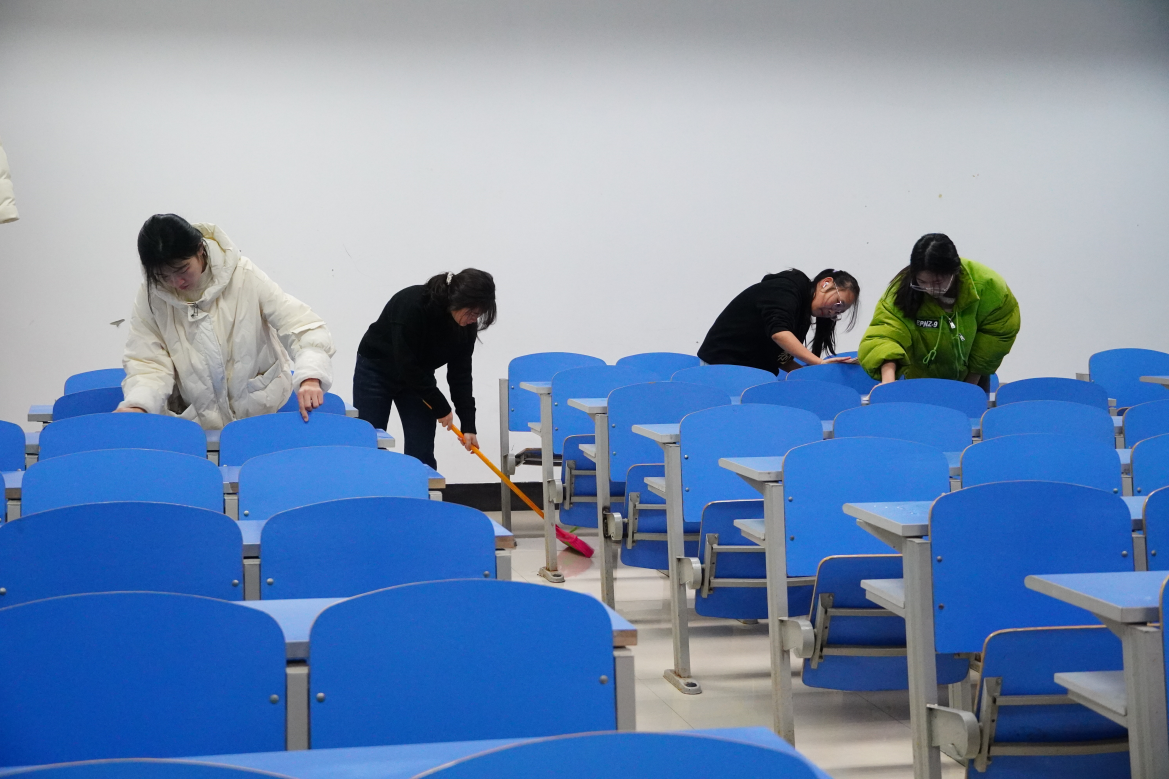 各位志愿者分小组对崇礼楼教室进行清洁打扫。同学们自带垃圾袋、毛巾等劳动工具积极参与清扫活动。清洁过程中,志愿者们热情高涨,以劳动为荣,乐在其中。他们细化分工,协调合作,细心地擦拭着门窗,清理黑板夹缝里的粉笔灰,用专用清洁剂擦除桌椅上的污渍、笔迹,对教室各个卫生死角进行全面清洁。劳动过程中,大家互相帮助,互相合作,展现了良好的团结协作精神。经过一个小时左右的清理劳动,教室环境焕然一新、干净整洁。