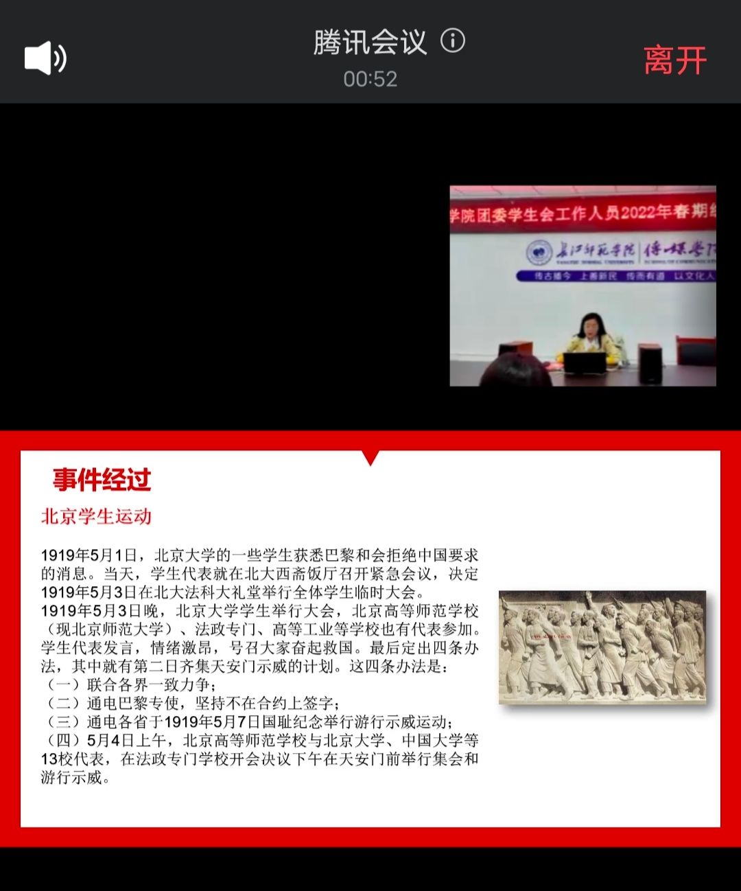 学生会各部门主要负责人在传媒学院格致楼2308会议室参与线下培训,各部门其余工作人员、各班班长团支书参与线上培训。培训中,谭喻老师以中国近代史上两大青年学生运动——“五四”运动和“一二·九”运动为例,详细讲述了两大运动的起因、经过和主要影响,指出作为学生干部应当铭记历史,以史为鉴,深入体会中国青年运动中所流露出的民族精神和爱国主义精神。其次,谭喻老师又主要从四个方面讲述了作为新时代青年应如何争做社会主义栋梁,在实现中华民族伟大复兴的事业中发光发热。其中谭喻老师特别强调同学们要培育和践行社会主义核心价值观,学习马克思主义指导思想,坚定“四个自信”,树立正确的政治立场。