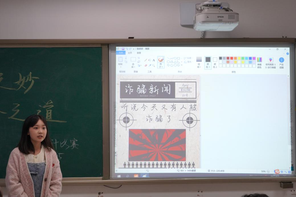 其中,来自2021级播音2班的陈妍妍小组,带来了以“电信诈骗”为主题的海报展示。她们抓住“瞄准镜”、“人民警察”、“网络深渊”等元素,利用精简的风格设计了海报底画,旨在告诉同学们:电信诈骗一般瞄准在校学生下手,一旦被骗就求助人民警察。她们在海报底部以“山河以秋,原无人被空话所惑”作结,精炼地表达了她们对安全绿色校园的期待。
