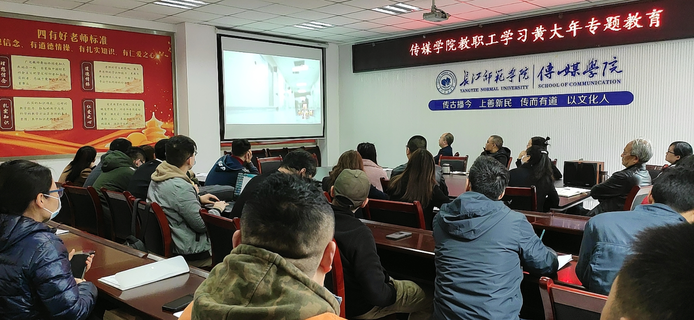 为加强师德师风建设,争做“四有”好老师,建功立业新时代,2022年4月1日下午,传媒学院组织教职工观看黄大年先进事迹影视片,学习黄大年同志心有大我、至诚报国的爱国情怀和教书育人、敢为人先的敬业精神。观影活动由党委书记肖云久同志主持,全体教职工参加。