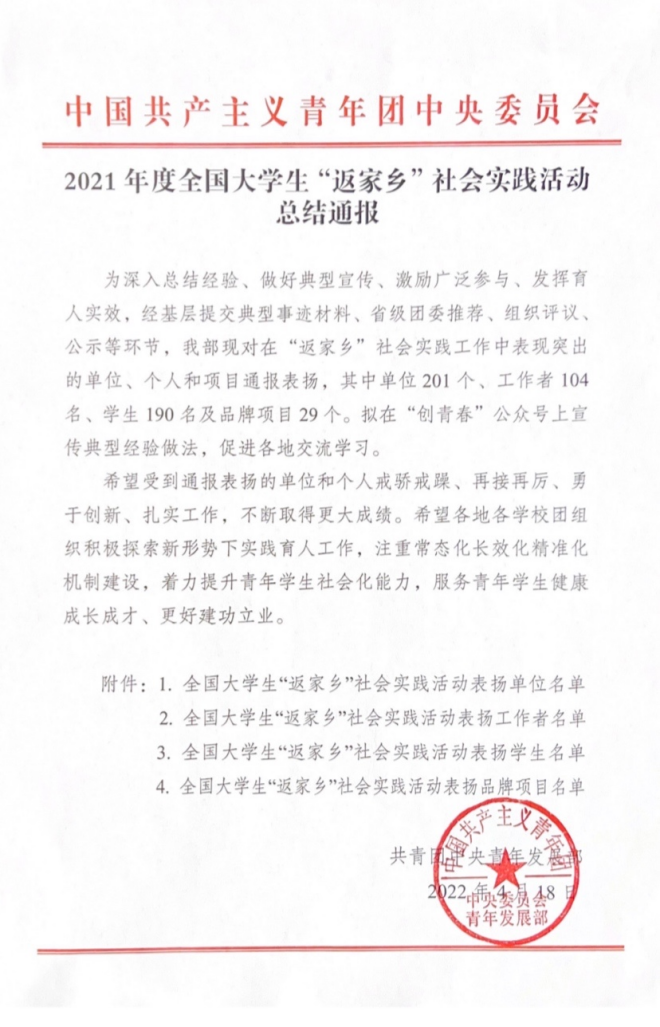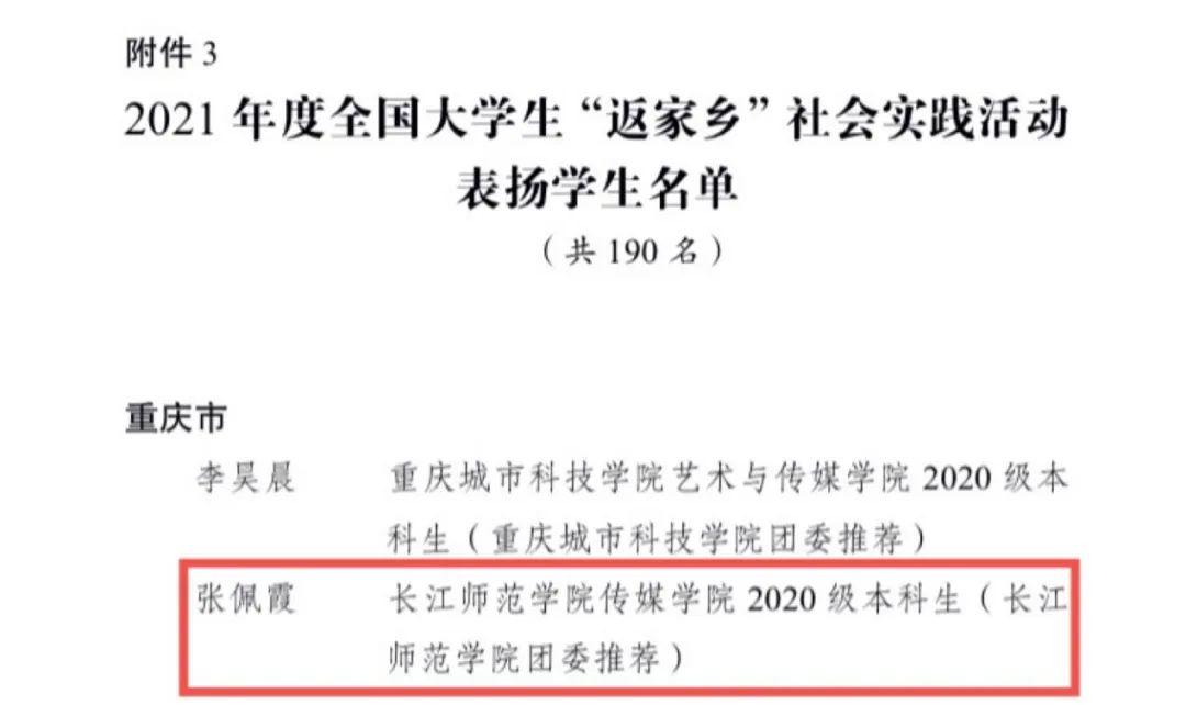为深入总结经验、做好典型宣传、激励广泛参与、发挥育人实效,近日,共青团中央开展了2021年度全国大学生“返家乡”社会实践活动总结通报工作。长江师范学院传媒学院学生张佩霞作为全国大学生“返家乡”社会实践活动先进个人获通报表扬,全市仅2名学生获此殊荣!