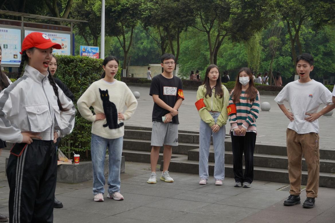 优秀学生志愿者加入到21级学生班级体中,带领21级同学进行普通话与英语口语练习。播音班学生以志愿者为中心围成圈,学生志愿者有计划地对同学们进行练声教学。