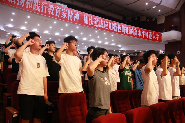 班会在庄严的宣誓环节达到高潮。在主讲人的带领下,全体新生肃立举手,以青春的名义庄严宣誓,铿锵誓言响彻礼堂,展现了新时代长师学子奋发向上的精神风貌。