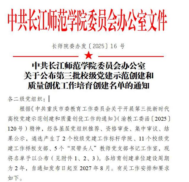 据悉,根据《中共重庆市委教育工作委员会关于开展第三批新时代高校党建示范创建和质量创优工作的通知》(渝教工委函〔2025〕120号)精神,学校经各基层党组织推荐、资格审查、集中审议、结果公示,遴选产生了2个校级党建工作标杆学院、11个校级党建工作样板支部、5个“双带头人”教师党支部书记工作室。