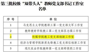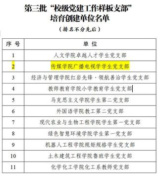 近日,学校公布了校级第三批新时代高校党建示范创建和质量创优工作培育创建名单,传媒学院广播电视学学生党支部入选第三批“校级党建工作样板支部”培育创建单位、传媒学院教工党支部杨颖工作室入选第三批校级“双带头人”教师党支部书记工作室。