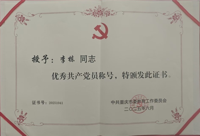日前,重庆市委教育工委发文,表彰2025年“先进党组织”“优秀共产党员”“优秀党务工作者”,我院教师李栋同志获评重庆市委教育工委“优秀共产党员”称号。