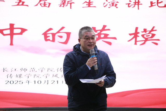 致敬英模精神,传媒逐光前行。10月21日晚7点,传媒学院在演播厅举办第二十五届新生“我心中的英模”演讲比赛复赛。此次活动由传媒学院学风建设部组织承办,传媒学院党委书记谢诗茂、播音与主持艺术专业系副主任李晓辰、2024级辅导员谭喻及2025级辅导员甘元琴担任评委。经过初赛选拔,共十位同学进入复赛。