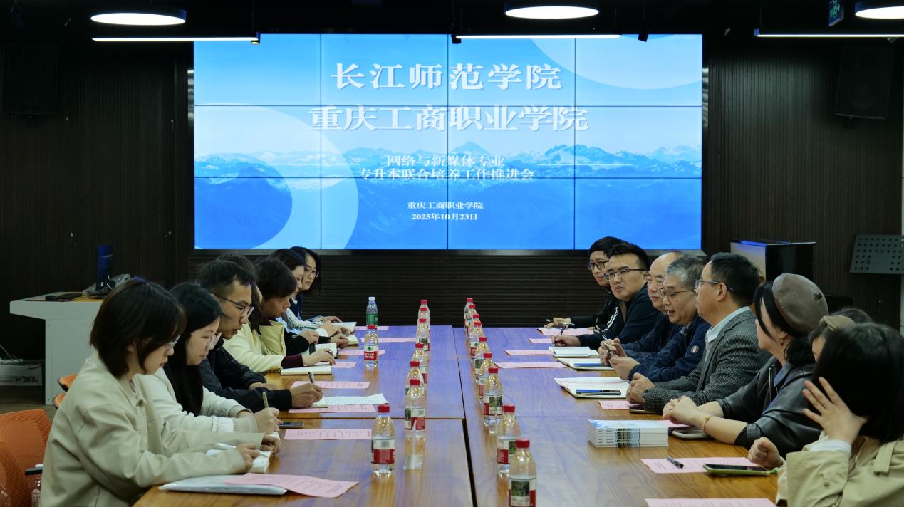 为深化校际合作,共育高素质应用型传媒人才,2025年10月23日下午,长江师范学院传媒学院一行在学院党委书记谢诗茂的带领下,赴重庆工商职业学院开展网络与新媒体专业“专升本”联合培养工作交流。本次交流活动在重庆工商职业学院华岩校区众创空间(实训楼二楼)举行,旨在通过深入研讨与实地考察,推动联合培养工作迈上新台阶。
