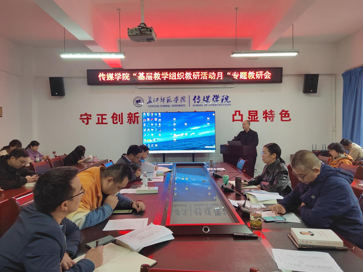 会上,汪志平副院长结合《长江师范学院关于开展“基层教学组织教研活动月”活动的通知》精神,对传媒学院“基层教学组织教研活动月”实施方案进行了全面解读与具体部署。在11月,传媒学院将严格落实实施方案的活动内容,加强基层教学组织建设,切实激发学院的基层教学组织活力。根据方案工作推进的时间安排,高质量完成本次基层教学组织教研活动月活动,在学院营造“重视教学、研究教学、崇尚创新”的质量文化氛围,共同推动学院教学工作质量再上新台阶。