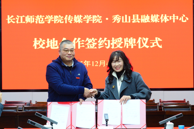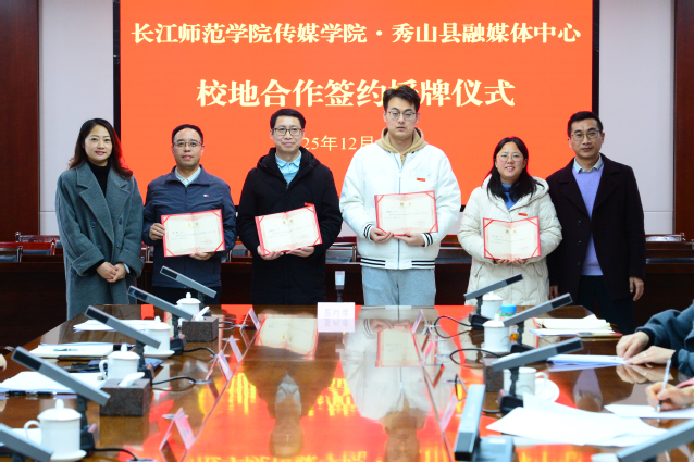 在与会人员见证下,传媒学院主要负责人与秀山融媒体中心负责人共同签署合作协议,并授秀山县融媒体中心“长江师范学院实践教学基地”牌匾。双方同步启动“双聘机制”融媒体中心聘请传媒学院教师担任发展顾问,学院则为秀山融媒体中心专家颁发行业导师聘书,推动人才双向赋能。
