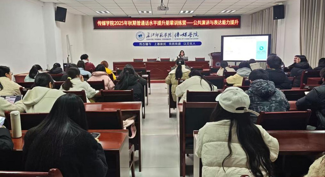 为进一步提升学生的语言表达感染力,推动普通话表达能力从“敢说”向“会说”迈进,12月18日晚7点,传媒学院2025年秋期普通话水平提升朋辈训练营第三期——“从‘敢说’到‘会说’,让表达更有‘温度’”课程在格致楼2308会议室顺利开展。本次活动由2024级播音与主持艺术3班刘文涵担任主讲人,来自各二级学院同学参与此次活动。