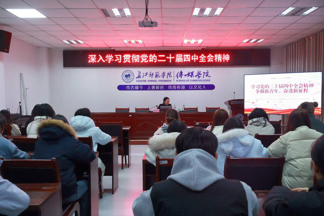 为深入学习贯彻党的二十届四中全会精神,引导青年学子将个人理想融入国家发展大局,12月18日晚7时,传媒学院深入学习党的二十届四中全会精神宣讲会于格致楼2308会议室顺利开展。传媒学院院长冉明仙担任本次宣讲会的主讲人,为2023级网新2班的全体同学带来一场内涵丰富的宣讲会。