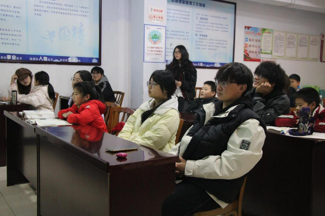 课堂上,第一组志愿者以“趣味英语单词”为核心,通过实物联想、互动问答等形式,将枯燥的单词学习转化为趣味游戏,耐心指导孩子们发音、记忆,帮助大家在轻松氛围中积累词汇、提升英语学习兴趣。第二组志愿者则聚焦地理知识教学,以“探秘奇妙地球”为主题,通过生动讲解带领孩子们认识山川湖海、风土人情,随后播放地理科普短片,让孩子们直观感受不同地域的独特魅力,加深对知识的理解与记忆。