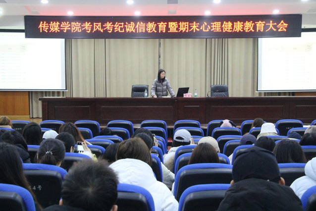1月4日下午18时,传媒学院在鉴湖学术报告厅召开考风考纪诚信教育暨期末心理健康教育大会。传媒学院2023级辅导员姚瑜担任主讲人,2023级全体学生参与本次大会。
