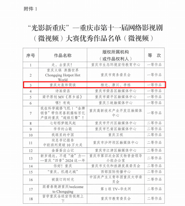 本次大赛以鼓励高质量网络视听内容创作为宗旨,共征集作品643件。经过严格评审与公示,最终评选出93件优秀作品及27个优秀组织单位。李栋老师参与创作的《重庆大轰炸简读》聚焦重庆历史记忆,以影像语言生动呈现历史事件,体现了深刻的城市人文关怀与扎实的创作功底,在众多参赛作品中脱颖而出,获得评委的高度认可。