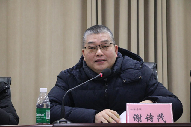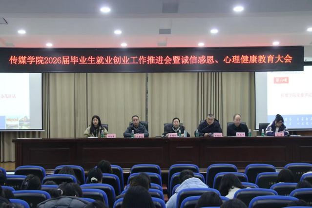 1月8日,传媒学院于鉴湖学术报告厅召开2026届毕业生就业创业工作推进会暨诚信感恩、心理健康教育大会。传媒学院党委书记谢诗茂、院长冉明仙、副院长汪志平、学工办主任兼团委书记王雯、实践教学中心主任张金龙、教学秘书邓金秀出席本次会议,传媒学院党委书记谢诗茂、学工办主任兼团委书记王雯担任主讲人,2026届全体毕业生参会。