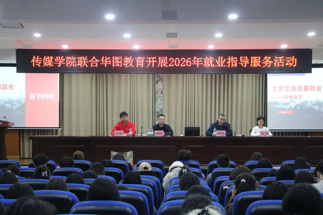 4月1日晚七点,长江师范学院传媒学院联合重庆华图教育在鉴湖学术报告厅开展2026年就业指导专题讲座。传媒学院党委书记谢诗茂、2023级辅导员姚瑜,重庆华图教育运营总监周孝华以及重庆华图教育涪陵分校校长苏牧超出席活动,2023级全体学生到场参与。