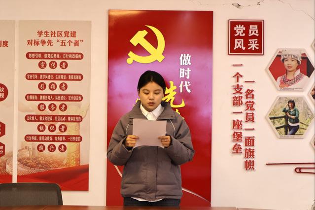 郑玉婷同志在汇报中回顾了在预备期间在思想、政治素养、学习、传承民族文化和生活五个层面的基本情况。她表示,预备期既是身份的过渡阶段,更是思想淬炼、能力提升的关键时期,在支部、学院系统的理论学习、常态化的组织生活和丰富的实践活动,自身在各方面均取得了长足进步。同时,她也客观剖析了自身存在的短板与不足,比如理论学习的系统性仍需加强、将专业所长转化为服务大局的能力有待提升等。她郑重表态,若能按期转正,将以正式党员的标准严格自我要求,持续深化理论学习、锤炼政治品格,把个人成长融入党组织发展和国家建设大局,立足专业优势主动担当作为,以实际行动践行党员的初心和使命。