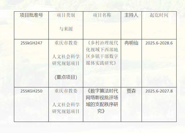 二、推行“带头人+团队”的科研组织机制。由学院领导、系主任及专业骨干教师牵头,组建跨学科、老中青结合的研究团队,集中优势资源申报高级别项目。近年来成功获批重庆市教委重点课题、重庆市教委人文社科重点项目,教指委项目等共5项,涵盖数字传媒人才培养、乡村治理现代化等领域,体现出较强的科研组织能力。如立项重庆市教委人文社科重点项目和一般项目共2项(分别是传媒学院院长冉明仙教授主持的重庆市教委规划项目(重点项目)《乡村治理现代化视域下西部地区乡镇干部数字媒体实践研究》和贾森老师负责的重庆市教委规划项目(一般项目)《数字算法时代网络影视批评场域的支配秩序研究》。